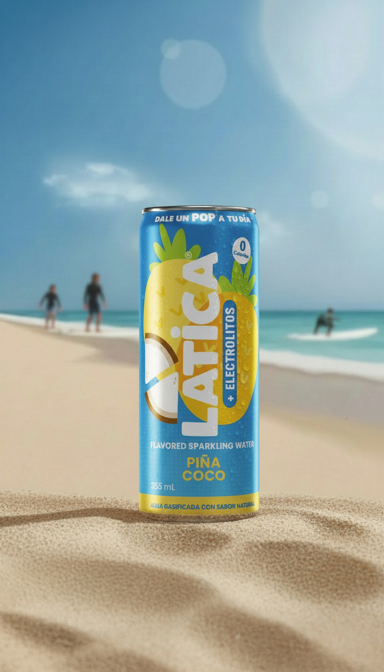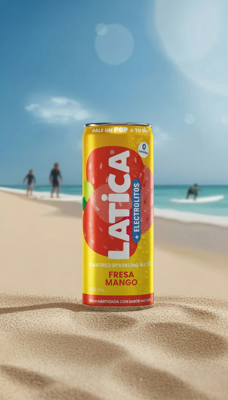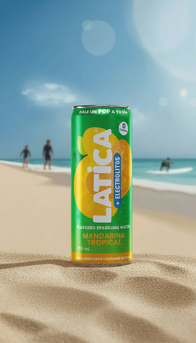 A looping animation of the can spinning on sand, cycling through all three flavors. Fully created with AI to capture summer vibes and that refreshing feeling of the first sip.